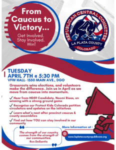 Mark your calendar! The La Plata County Republican Party gathers every first Tuesday of the month at 5:30 p.m. at the VFW Hall – 1550 Main Ave, Durango.